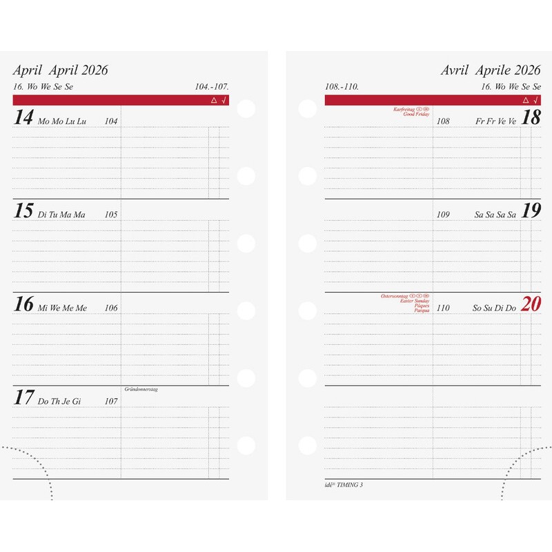 IDÉ® TIMING Jahresinhalt viersprachig d/f/i/gb, Druck schwarz/rot, mit Jahresplaner Leporello, 3-teilig. TIMING 3 7,6 x 12,7 cm 1 Woche auf 2 Seiten