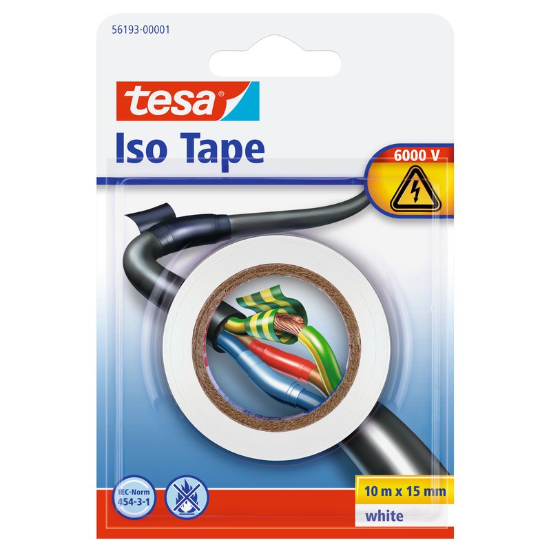 TESA® Elektro-Isolierband schwer entflammbar, zum Reparieren, Isolieren, Bündeln sowie Befestigen von Kabeln, bewahrt Kabelmäntel vor Beschädigungen, leichtes Umwickeln auch bei unebenen Untergründen, sicherer Schutz vor Stromstärken bis 6000 V. Zertifikat: IEC Norm 454-3-1. 15 mm x 10 m