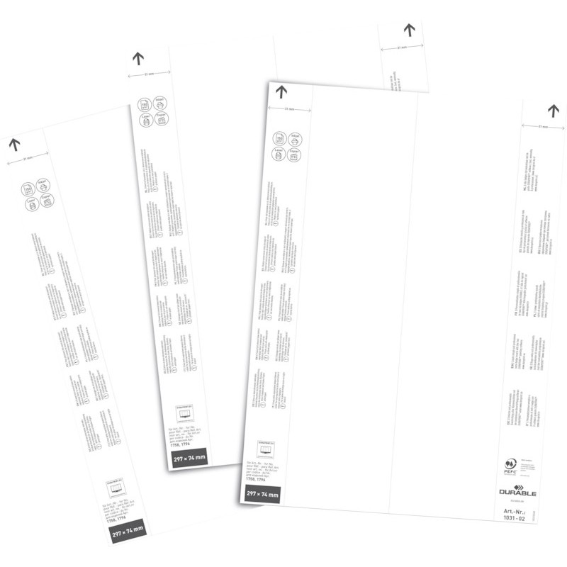 DURABLE Einsteckschilder für Logistiktaschen weiss, Etiketten-Bogen mikroperforiert, Format A4, zur professionellen Beschriftung im Lager und der Produktion, geeignet für DURABLE Kennzeichnungstaschen, einfache Beschriftung mit kostenloser Beschriftungssoftware Duraprint® unter www.duraprint.de. Geeignet für Kopierer, Laser-/Inkjetdrucker und Farblaserdrucker/-kopierer. Nachhaltigkeit eco:plus: recyclingfähig.