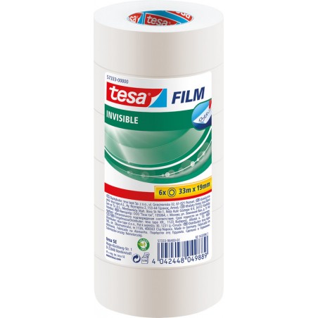 TESA® Klebeband Film invisible nahezu unsichtbar auf weissem Papier und matten Oberflächen, mit fast allen Schreibgeräten beschriftbar, leichtes und geräuschloses Abrollen, schattenfrei kopierbar, hohe Alterungsbeständigkeit, PP-Folie und lösungsmittelfreie Klebmasse.