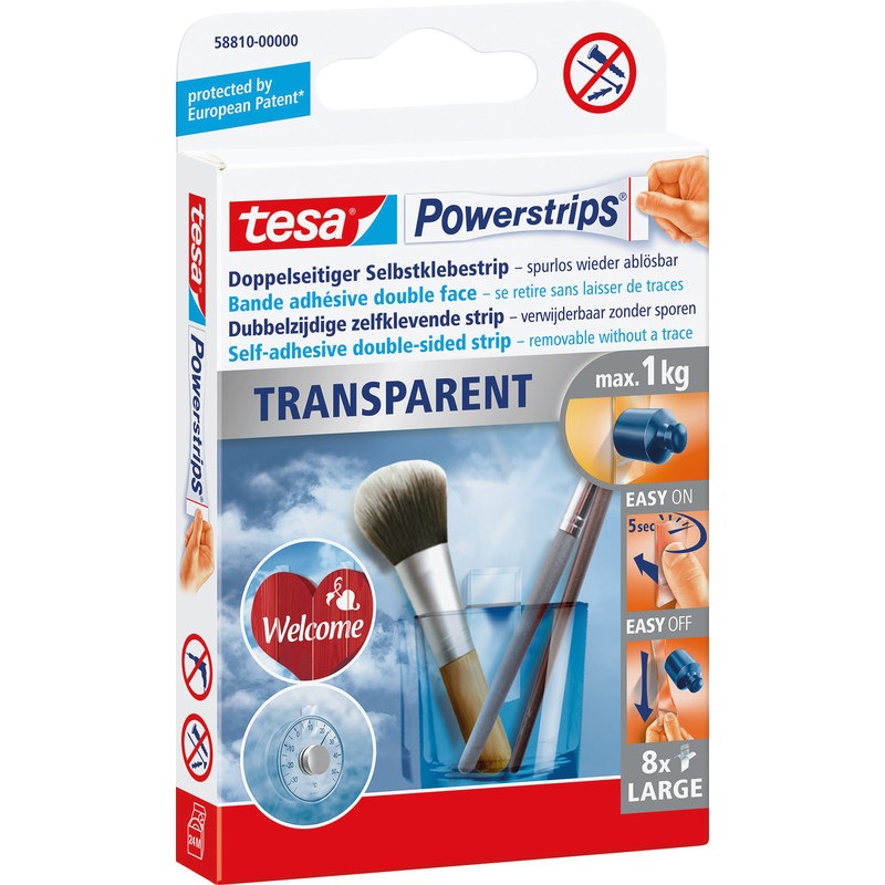 TESA® Powerstrips® Transparent Large transparenter Klebestreifen, begrenzt UV-beständig, beidseitig klebend, unsichtbarer Halt, zum Dekorieren von Fenstern, Glas und Spiegeln mit leichten und flachen Gegenständen wie z. B. Fotos, Postern, Karton- und Papierdekorationen, spurlos ablösbar, Belastbarkeit bis 1 kg. Packung zu 8 Powerstrips®.