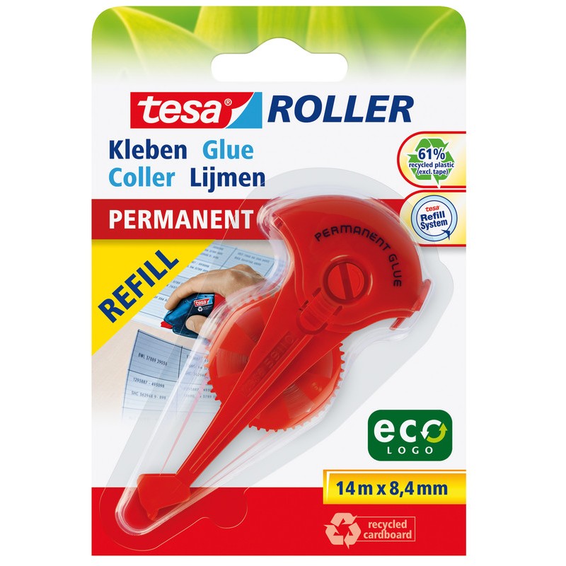 TESA® Kleberoller ecoLogo® Refill permanent Blister klebt dauerhaft, klebt Papier, Karton, Fotos, Kunststoff, Glas, lösungsmittelfrei, Gehäuse aus 100% recyceltem Kunststoff, Bandmasse: B 8,4 mm x L 14 m, nachfüllbar. Nachhaltigkeit eco:plus: zerlegbar konstruiert, verlängertes Produktleben, recyclingfähig, recycelter Bestandteil, umweltfreundliche Verpackung.