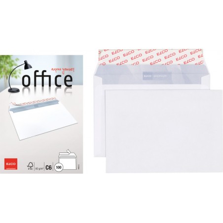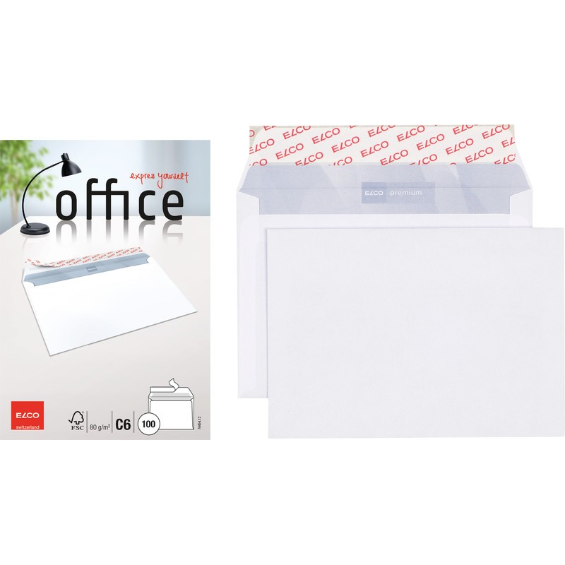 ELCO Briefumschläge Office in Kleinpackung hochweisse Top-Qualität, chlorfrei, grauer Innendruck aus 100% Wasserfarbe. Nachhaltigkeit eco:plus: recyclingfähig. Zertifikat: FSC. C6, mit Optifix® Haftklebeverschluss 162 x 114 mm, Façon DNG-HK. Cello-Zip zu 100 Stück.