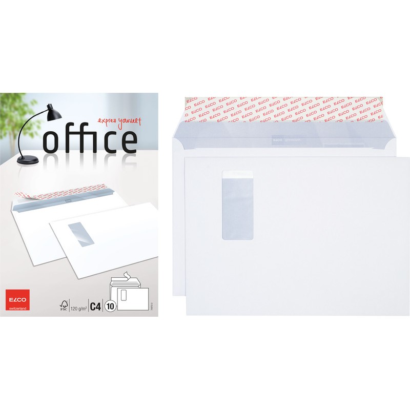 ELCO Briefumschläge Office in Kleinpackung hochweisse Top-Qualität, chlorfrei, grauer Innendruck aus 100% Wasserfarbe. Nachhaltigkeit eco:plus: recyclingfähig. Zertifikat: FSC. C4, mit Optifix® Haftklebeverschluss 324 x 229 mm, Façon DNG-HK. Cello-Zip zu 10 Stück.