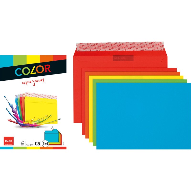 ELCO Briefumschläge Color in Kleinpackung farbig, elementarchlorfrei. Nachhaltigkeit eco:plus: recyclingfähig. Zertifikat: FSC. C5, mit Optifix® Haftklebeverschluss, farbig sortiert 229 x 162 mm, Façon DNG-HK. Cello-Zip zu 20 Stück, je 4 Stück intensivrot, orange, intensivgelb, intensivgrün und intensivblau.