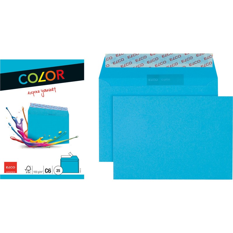 ELCO Briefumschläge Color in Kleinpackung farbig, elementarchlorfrei. Nachhaltigkeit eco:plus: recyclingfähig. Zertifikat: FSC. C6, mit Optifix® Haftklebeverschluss, farbenrein 162 x 114 mm, Façon DNG-HK. Cello-Zip zu 25 Stück.