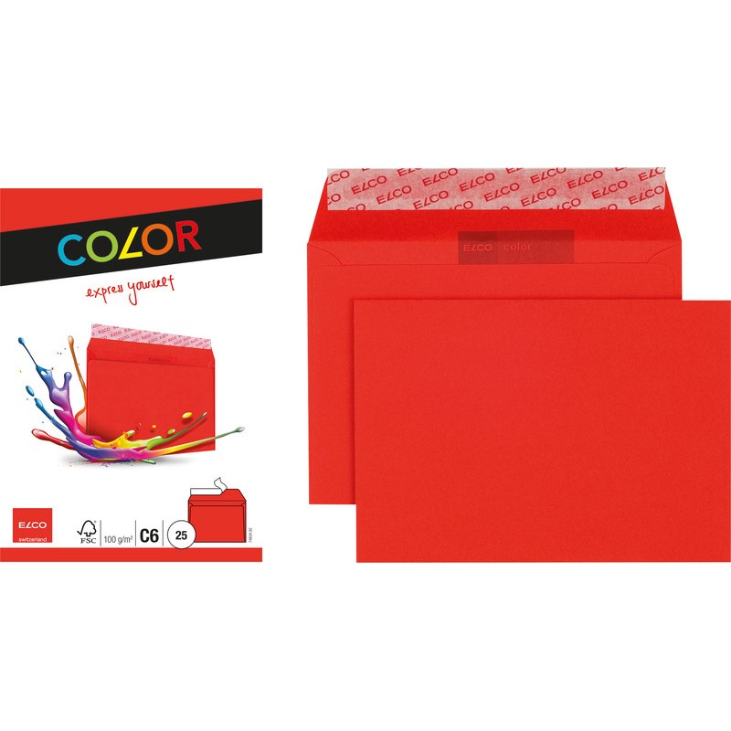 ELCO Briefumschläge Color in Kleinpackung farbig, elementarchlorfrei. Nachhaltigkeit eco:plus: recyclingfähig. Zertifikat: FSC. C6, mit Optifix® Haftklebeverschluss, farbenrein 162 x 114 mm, Façon DNG-HK. Cello-Zip zu 25 Stück.