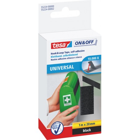 TESA® on&off Klettband universal zum Aufkleben Allzweck-Klettband, selbstklebend, hält leichte Gegenstände und Textilien, 10000 Mal öffnen und schliessen.