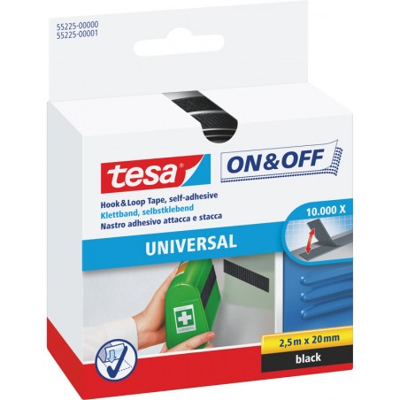 TESA® on&off Klettband universal zum Aufkleben Allzweck-Klettband, selbstklebend, hält leichte Gegenstände und Textilien, 10000 Mal öffnen und schliessen.