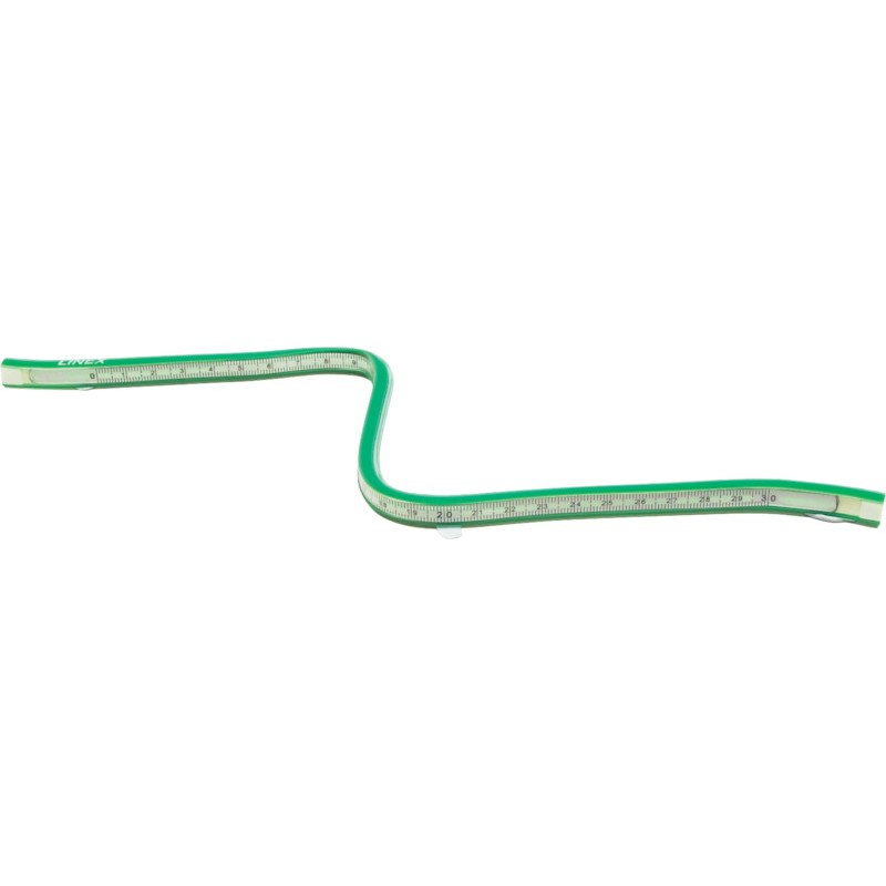LINEX® Kurvenlineal flexibel aus grünem Vinyl, Vierkantprofil, horizontal biegsam, Masseinteilung in mm.
