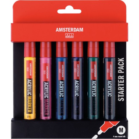 AMSTERDAM Acrylic Marker Rundspitze, brillante Farbe auf Wasserbasis, sehr hohe Lichtechtheit, besonders geeignet, um auf Acrylbildern Akzente zu setzen, malen oder schreiben auf vielen Materialien, z. B. Leinwand, Holz und Terrakotta, schnelltrocknend, nach Trocknung wasserfest, nicht nachfüllbar, Strichbreite ca. 4 mm. 6er Set (primärgelb, chinacridonrosa, brillantblau, ultramarin violett,