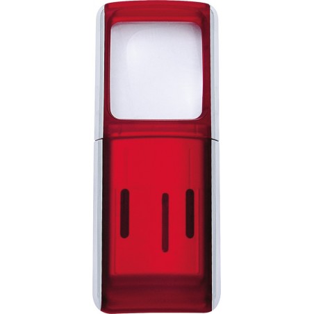 WEDO® Rechtecklupe mit LED-Licht aus ABS, extra helles, weisses LED-Licht wird durch einfaches Hochziehen des Gehäuseoberteils eingeschaltet, Kunststofflinse B 35 x H 38 mm, vergrössert 3-fach, inkl. 2 x 3 V Batterien (CR1220), farbig sortiert. Masse: B 47 x H 118 x T 14 mm. Gewicht: 48 g. Preis inkl. VEG.