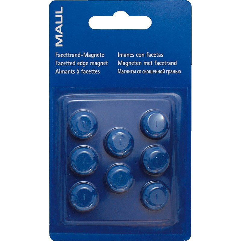 MAUL Facetterand-Magnete pro auf Blistercard Gehäuse aus bruchsicherem Luran, Oberfläche leicht erodiert, mit hochglanzpoliertem Facetterand, Spezialkleber sorgt für starken Halt des Magnetkerns im Gehäuse, Unterseite zum Schutz der magnetischen Oberfläche lackiert. Rundmagnete, Ø 15 mm, H 7 mm, Haftkraft 0,17 kg, Blister zu 8 Stück