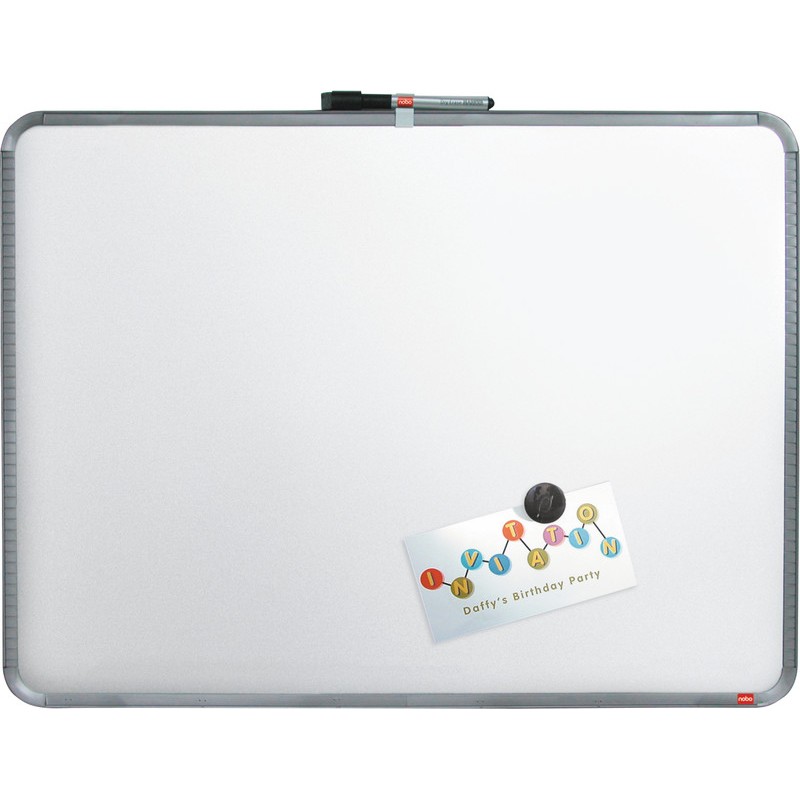 NOBO® Magnettafel zum Beschriften mit trocken abwischbaren Markern, magnetische Oberfläche, inkl. Marker mit integriertem Schwämmchen und Magnethalterung, 2 Magnete, Selbstklebestreifen und magnetische Aufhänger, Wandmontage im Hoch- oder Querformat möglich. Kunststoffrahmen silber metallic, Oberfläche silber