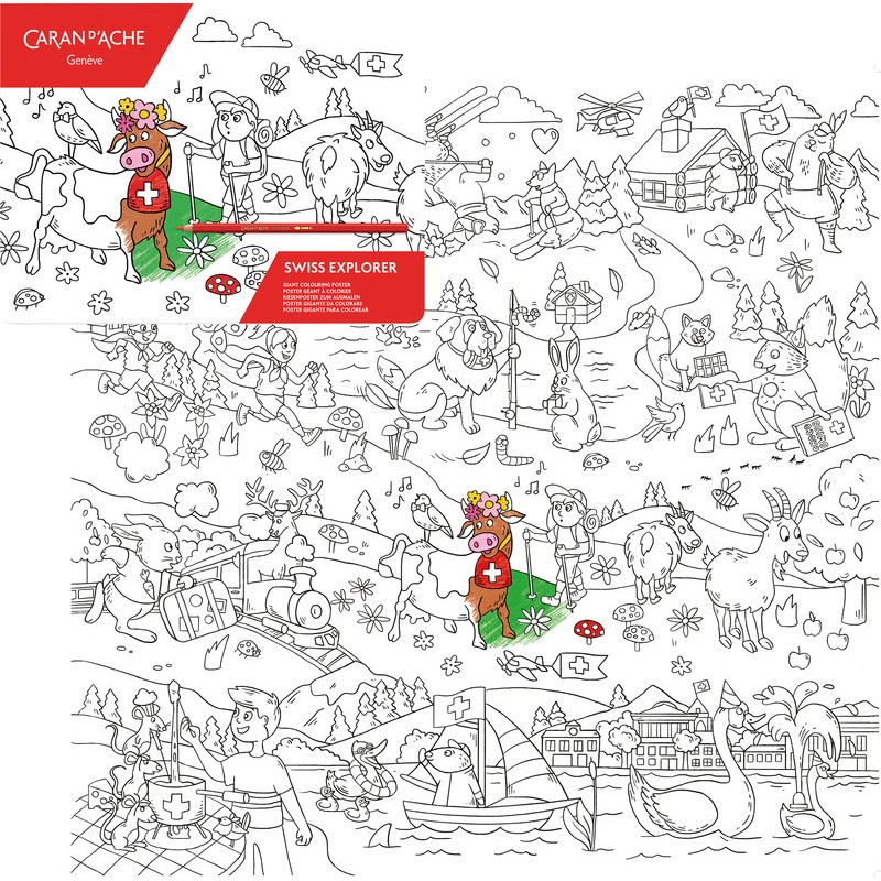 CARAN D'ACHE Poster zum Ausmalen Swiss Explorer Riesenposter zum Ausmalen mit typisch schweizerischer Szenerie, Zeichenpapier, 120 g/m2, Umschlag 325 g/m2, ideal für alle Kolorationsmedien von Caran d'Ache, trockene oder wasservermalbare Farbstifte, Neocolor(TM) I und II sowie für die Fasermaler Fibralo und Fibralo Brush, Format 900 x 900 mm.