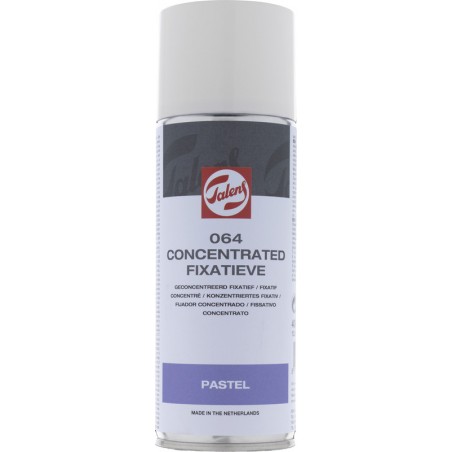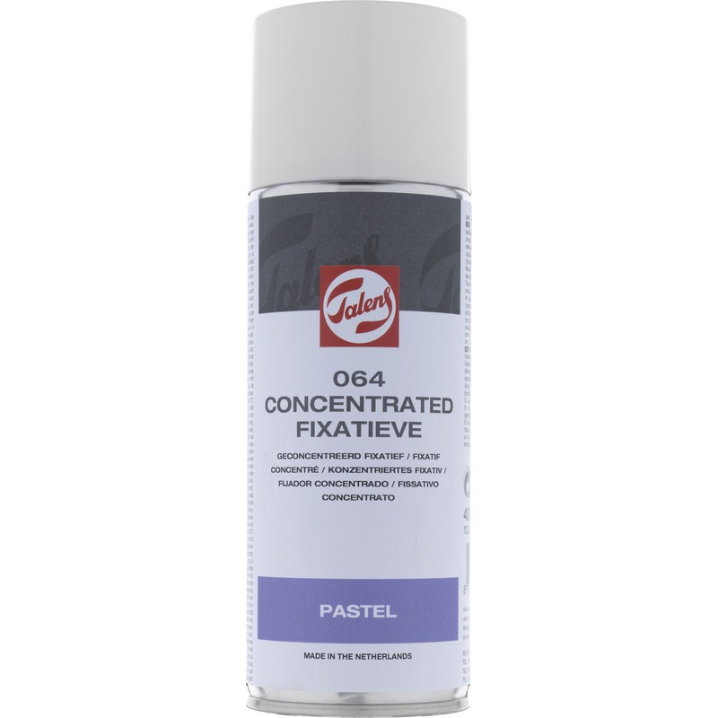 TALENS Fixativ Spray 064 konzentriert Verbesserung der Haftung von Pastell-, Holzkohle-, Kreide- und Grafitteilchen auf dem Malgrund, Zusammensetzung: farblose Harze, Äthanol, in Kombination mit Pastellen vorzugsweise auf jede einzelne Pastellschicht auftragen, sparsam verwenden, schnell trocknend, nicht vergilbend, leicht entzündlich.