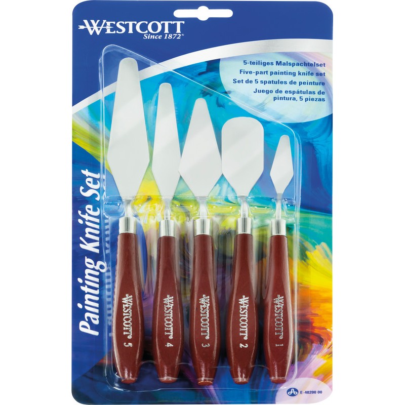 WESTCOTT® Malspachtel Klinge aus Stahl, Holzgriff, zum Mischen von Farben, Struktur- und Effekttechniken etc., 5 Klingen sortiert. Blister zu 5 Stück.