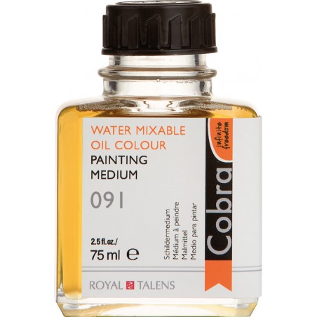 COBRA Malmittel 091 macht die Farbe fetter, vergrössert den Glanz und die Transparenz, lässt den Pinselstrich verschwimmen, keinen Einfluss auf die Trocknungszeit der Farbe, erhöht die Langlebigkeit des Farbfilms, mit Wasser verdünnbar, kann vergilben. Flasche zu 75 ml.