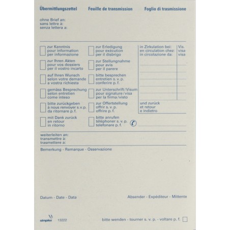 SIMPLEX Übermittlungsblock Recyclingpapier, 60 g/m2, 70 Blatt, auf Kartonunterlage geleimt, Vordruck in 3 Sprachen.