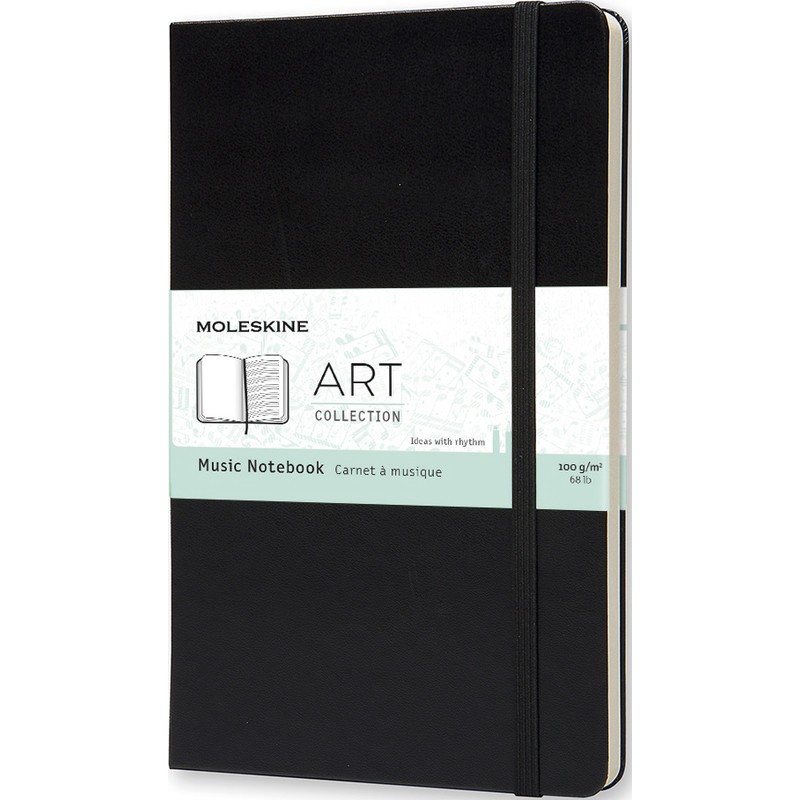 MOLESKINE® Notizbuch Kreativ Musik Art Collection aus PP, Gummibandverschluss, abgerundete Ecken, säurefreies Papier, 100 g/m2, Lesezeichen, interne Falttasche aus Karton und Textil. Nachhaltigkeit eco:plus: Recycelgehalt Abfall nach Gebrauch max. 50%. Zertifikat: FSC. Large 130 x 210 mm, fester Einband, 192 Seiten links blanko Seiten und rechts Notenlinienlayout, mit Notensystemlineal.