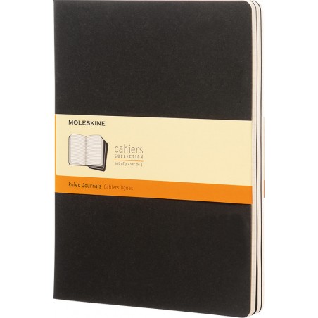 MOLESKINE® Notizhefte Cahiers Collection abgerundete Ecken, säurefreies Papier, 70 g/m2, sichtbare Fadenheftung am Rücken, mit grosser Innentasche für lose Notizzettel. Packung zu 3 Stück. Nachhaltigkeit eco:plus: Recycelgehalt Abfall nach Gebrauch max. 50%. Zertifikat: FSC. Xtra Large 190 x 250 mm, Kartoneinband, 120 Seiten die letzten 16 Seiten sind heraustrennbar.