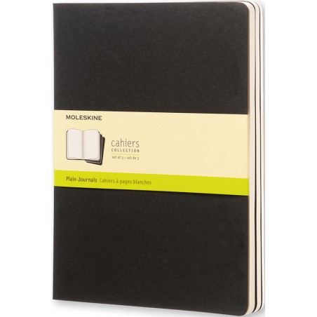 MOLESKINE® Notizhefte Cahiers Collection abgerundete Ecken, säurefreies Papier, 70 g/m2, sichtbare Fadenheftung am Rücken, mit grosser Innentasche für lose Notizzettel. Packung zu 3 Stück. Nachhaltigkeit eco:plus: Recycelgehalt Abfall nach Gebrauch max. 50%. Zertifikat: FSC. Xtra Large 190 x 250 mm, Kartoneinband, 120 Seiten die letzten 16 Seiten sind heraustrennbar.