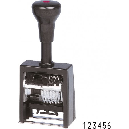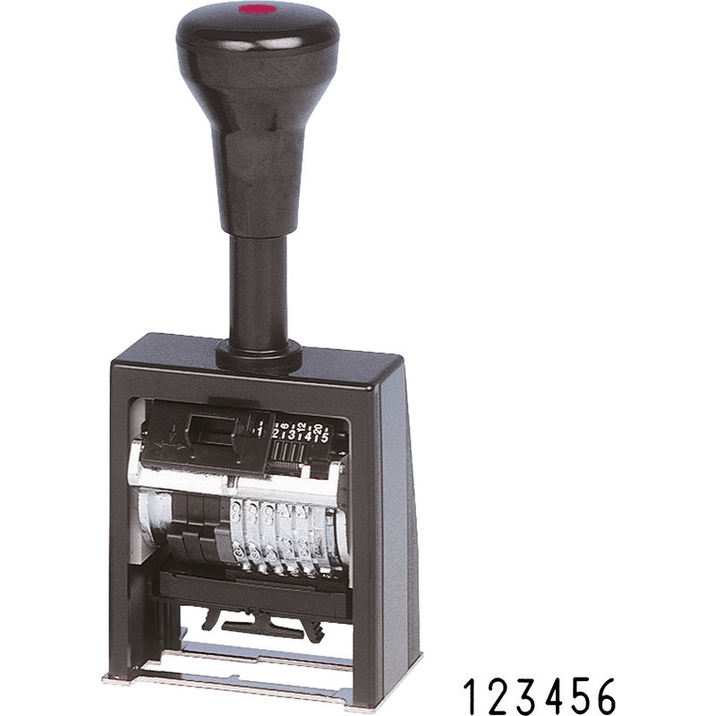 REINER® Numeroteur mit Ziffernrädern aus Druckguss und automatischem Farbauftrag, 10000 - 20000 saubere Abdrucke, inkl. schwarz eingefärbtem Kissen und Verstellstift. B 6 K Block mit 6 Ziffernrädern, davon 5 Räder automatisch schaltend, mit oder ohne vorstehende Nullen. Einstellung: fortlaufende 0, 1, 2, 3, 4, 5, 6, 12 und 20fache Wiederholung, Kunststoffgehäuse.