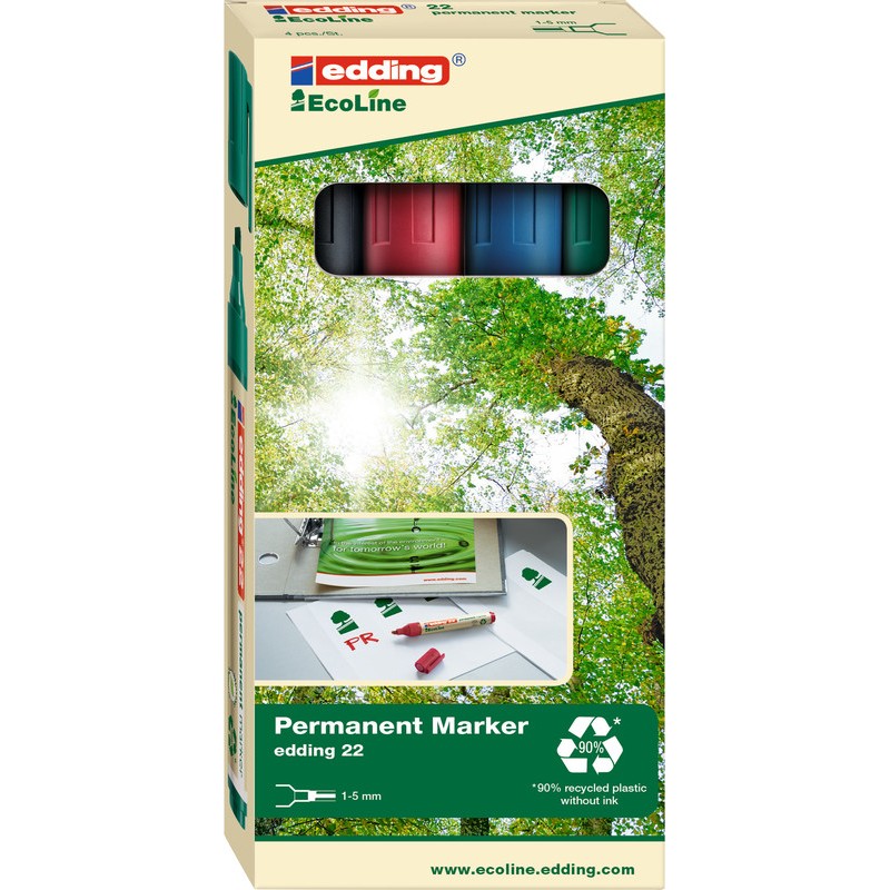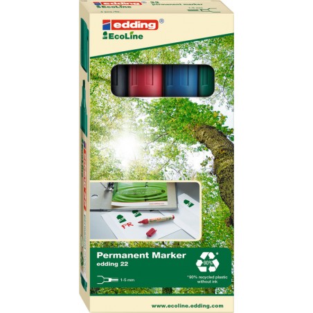 EDDING® Permanent Marker 22 EcoLine Keilspitze, Spitze auswechselbar, schnelltrocknend, lichtbeständig, wisch- und wasserfest, ohne Zusatz von Toluol/Xylol, Kunststoffteile sind zu 90% aus recyceltem Material, nachfüllbar, Strichbreite ca. 1 - 5 mm. Nachhaltigkeit eco:plus: verlängertes Produktleben, recyclingfähig, recycelter Bestandteil, Recycelgehalt Abfall nach Gebrauch max. 83%.