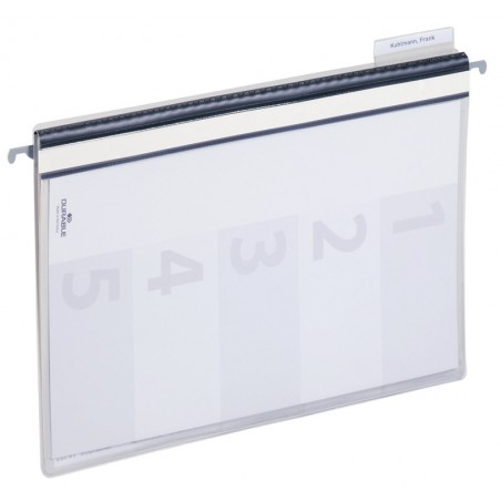 DURABLE Personal- und Kredithefter für gelochtes Schriftgut, Vorderdeckel transparent als A4-Sichttasche mit Inhaltsverzeichnis, Beschriftungsstreifen, Beschriftungssoftware unter www.duraprint.de, 5-teilig mit Grifftaben sowie pro Unterteilung eine Heftmechanik, inkl. Reiter und Hängeschiene, mit Zusatztasche im Innenteil für ungelochtes Schriftgut, für Format A4. Nachhaltigkeit eco:plus: recyclingfähig.