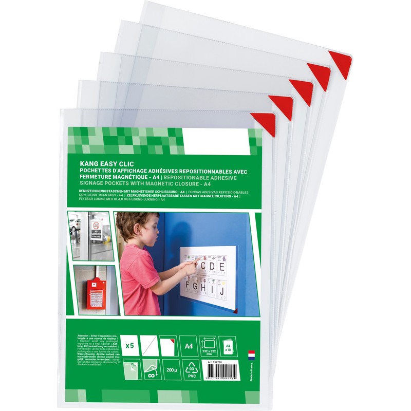 DJOIS t-view Selbstklebetaschen Kang® easy clic farblos, mit 2 Klebestreifen auf der Rückseite, Vorderseite auf 2 Seiten geöffnet, Verschluss mit Magnet, haftet auf allen glatten Oberflächen, spurlos ablösbar, Fassungsvermögen bis zu 10 Blatt, für Format A4. Beutel zu 5 Stück. Nachhaltigkeit eco:plus: verlängertes Produktleben, umweltfreundliche Verpackung.