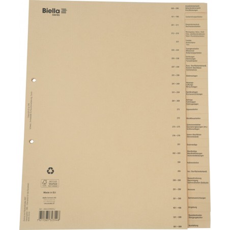 BIELLA Bauabrechnungsregister aus Recyclingkarton, 170 g/m2, braun, 26-teilig, 2 Loch, Format 210/240 x 297 mm, für Format A4, offizielles Bauabrechnungsregister der Schweizerischen Zentralstelle für Baurationalisierung CRB. Nachhaltigkeit eco:plus: recycelter Bestandteil. Zertifikat: FSC.