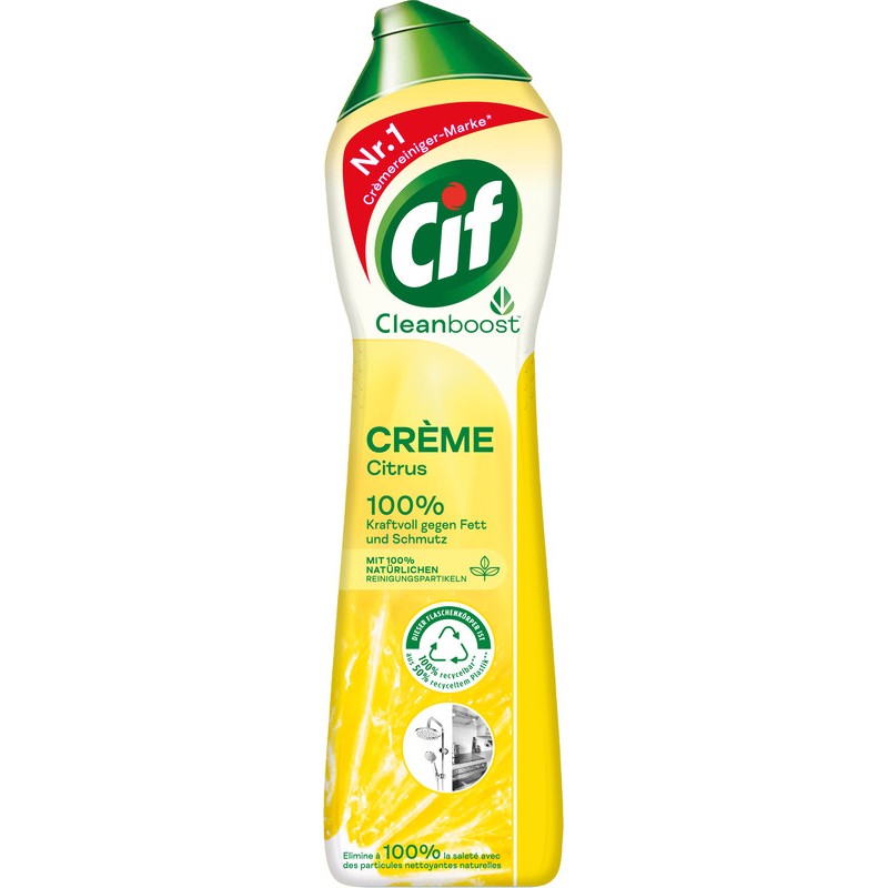 CIF® Allzweckreiniger Crème Citrus mit Mikropartikeln, entfernt Schmutz, Kalk- und Fettablagerungen, mit einem feuchten Schwamm auftragen, dann sauberwischen und nachspülen, nicht auf lackierten Oberflächen und empfindlichen Kunststoffen anwenden, mit Zitronenduft.