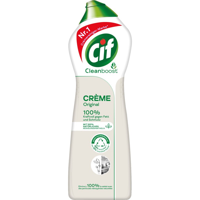 CIF® Allzweckreiniger Crème Original mit Mikropartikeln, entfernt Schmutz, Kalk- und Fettablagerungen, mit einem feuchten Schwamm auftragen, dann sauberwischen und nachspülen, nicht auf lackierten Oberflächen und empfindlichen Kunststoffen anwenden. Flasche zu 750 ml.