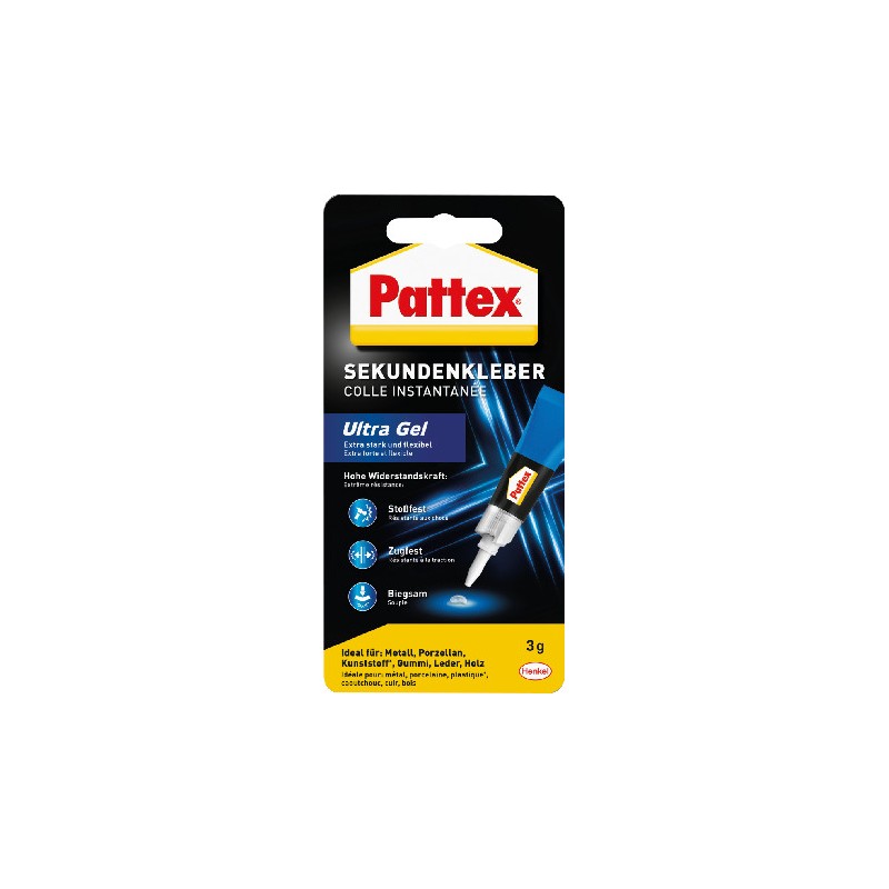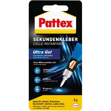 PATTEX® Sekundenkleber Ultra Gel flexibler Sekundenkleber dank Micro-Gummipartikel, tropft nicht, universell, gelförmig, klebt fast alle Materialien, nicht geeignet für Glas, PE und PP, kurz korrigierbar, schlag- und wasserfest, bruchsicher, vibrationsdämpfend, Tubenverschluss mit Nadel, keine verklebte Spitze, lösungsmittelfrei.