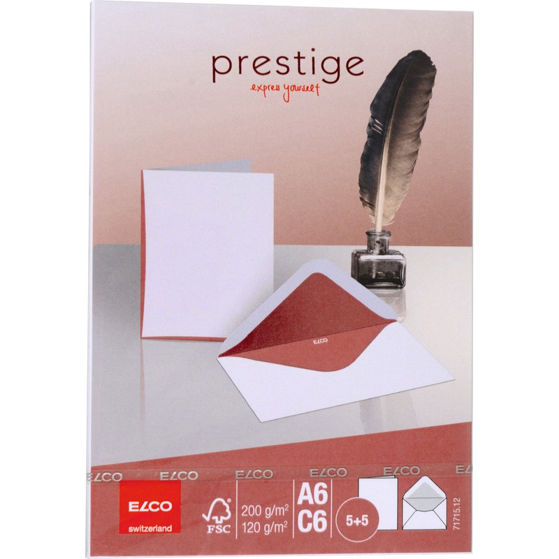 ELCO Doppelkarten mit Briefumschläge Prestige Doppelkarten: aus weissem Karton, 200 g/m2, leicht satiniert, auf 2 Seiten mit farbigem Rand, Briefumschläge: aus weissem Papier, 120 g/m2, mit farbigem Innendruck, gummierte Spitzklappe, Façon L. Cello-Zip zu 5 Sets. Nachhaltigkeit eco:plus: recyclingfähig. Zertifikat: FSC.