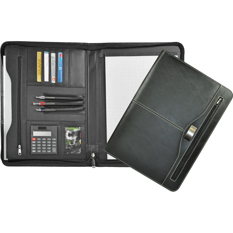 Schreibmappe Vermonti A4 aus Kunstleder, mit Reissverschluss, Blockhalterung inkl. Schreibblock, 5 Kartenfächer, diverse Steckfächer, Reissverschlussfach innen und aussen, 3 Schreibgerätehalterungen, Rechner, für Format A4. Masse: B 260 x H 360 x T 30 mm. Preis inkl. VRG. Nachhaltigkeit eco:plus: verlängertes Produktleben, recycelter Bestandteil, Recycelgehalt Abfall vor Gebrauch max. 20%, Recycelgehalt Abfall nach Gebrauch max. 60%, Abfallminderung, umweltfreundliche Verpackung.