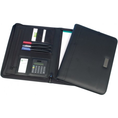Schreibmappe mit Taschenrechner aus Kunstleder, mit Reissverschluss, Blockhalterung exkl. Schreibblock, 4 Kartenfächer, 3 Schreibgerätehalterungen, Reissverschluss- und Einschubfach innen, für Format A4. Masse: B 270 x H 350 x T 25 mm. Preis inkl. VRG.