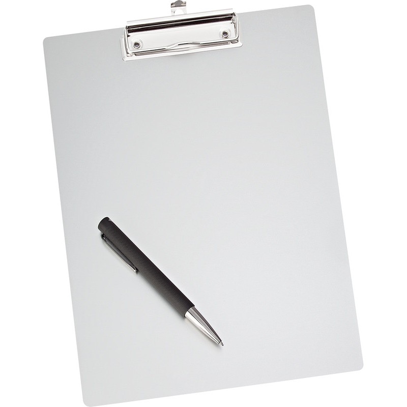 WEDO® Schreibplatte A4 aus 1,4 mm poliertem, leicht mattem Aluminium, abgerundete Ecken, starke, kurze Klemme, Aufhängeöse, für Format A4.