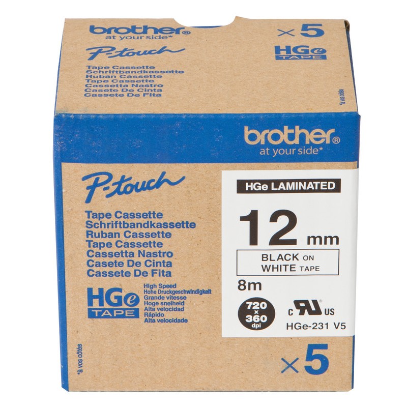 BROTHER P-touch Schriftband HGe laminiert hohe Druckgeschwindigkeit, Länge 8 m. Packung zu 5 Stück. Breite 12 mm