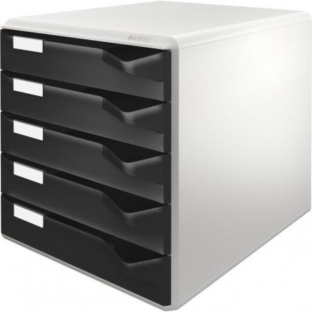 LEITZ® Schubladenelement aus PS, Auszugsstopp und Schubladeneinzug, mit auswechselbarem Beschriftungsschild, rutschfeste Gummifüsse, Gehäuse hellgrau, für Format A4. Post-Set mit 5 Schubladen gross Aussenmasse: B 285 x H 290 x T 355 mm, Innenmasse Schubladen: B 255 x H 50 x T 330 mm.