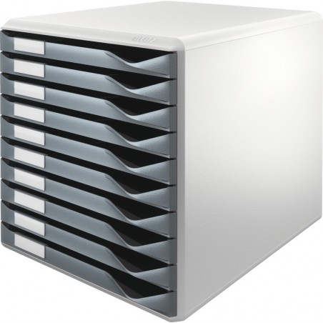 LEITZ® Schubladenelement aus PS, Auszugsstopp und Schubladeneinzug, mit auswechselbarem Beschriftungsschild, rutschfeste Gummifüsse, Gehäuse hellgrau, für Format A4. Formular-Set mit 10 Schubladen klein Aussenmasse: B 285 x H 290 x T 355 mm, Innenmasse Schubladen: B 255 x H 25 x T 330 mm.