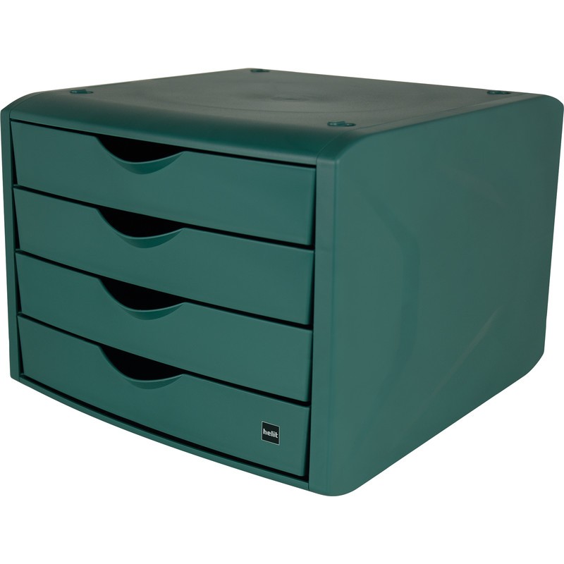 HELIT Schubladenelement the green chameleon aus 80% recyceltem Post Consumer Abfall (PCR), mit 4 geschlossenen Schubladen, stapelbar, Auszugsstopp, matte Oberfläche, für Format A4. Aussenmasse: B 260 x H 212 x T 330 mm. Nachhaltigkeit eco:plus: verlängertes Produktleben, recyclingfähig, recycelter Bestandteil, Recycelgehalt Abfall vor Gebrauch max. 97%, Recycelgehalt Abfall nach Gebrauch max. 100%, Abfallminderung, umweltfreundliche Verpackung. Zertifikat: Der Blaue Engel.