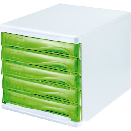 HELIT Schubladenelement the wave Colours mit 5 geschlossenen Schubladen aus PS, Gehäuse aus PP, für Format A4. Aussenmasse: B 265 x H 250 x T 340 mm. Nachhaltigkeit eco:plus: verlängertes Produktleben, recyclingfähig, Recycelgehalt Abfall nach Gebrauch max. 100%, Abfallminderung.