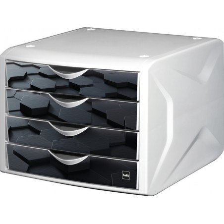 HELIT Schubladenelement the chameleon aus PP, mit 4 geschlossenen Schubladen, Gehäuse weiss, stapelbar, Auszugsstopp, für Format A4. Aussenmasse: B 260 x H 212 x T 330 mm. Nachhaltigkeit eco:plus: verlängertes Produktleben, recyclingfähig, Recycelgehalt Abfall nach Gebrauch max. 100%, Abfallminderung, umweltfreundliche Verpackung. 4 geschlossene Schubladen