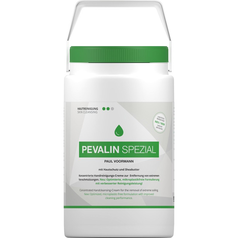 PEVALIN SPEZIAL Handreinigungs-Creme entfernt mühelos hartnäckigen Schmutz wie Farbe, Öle, Teer, Bitumen etc., mit Hautschutz, verstopft keine Abflüsse, kann auch ohne Wasser benutzt werden. Nachhaltigkeit eco:plus: abbaubar.