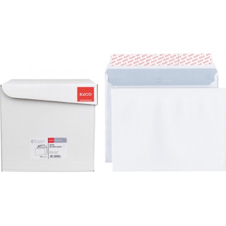 ELCO Briefumschläge Documento mit Seitenfalten, weiss weiss Kraft, Seitenfalten 20 mm, Innendruck grau. Nachhaltigkeit eco:plus: recyclingfähig. Zertifikat: FSC. B4, mit Optifix® Haftklebeverschluss 353 x 250 mm, Façon DNS-HK. Schachtel zu 200 Stück.