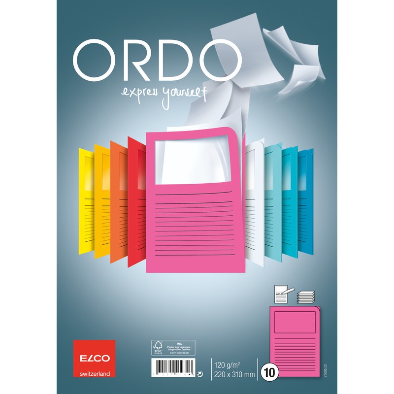 ELCO Sichthüllen Ordo classico aus Papier, 120 g/m2, Mappengrösse 220 x 310 mm, Sichtfenster Format 180 x 100 mm, für Format A4. Nachhaltigkeit eco:plus: recyclingfähig, recycelter Bestandteil. Zertifikat: FSC. mit Beschriftungsvordruck Cello-Zip zu 10 Stück.