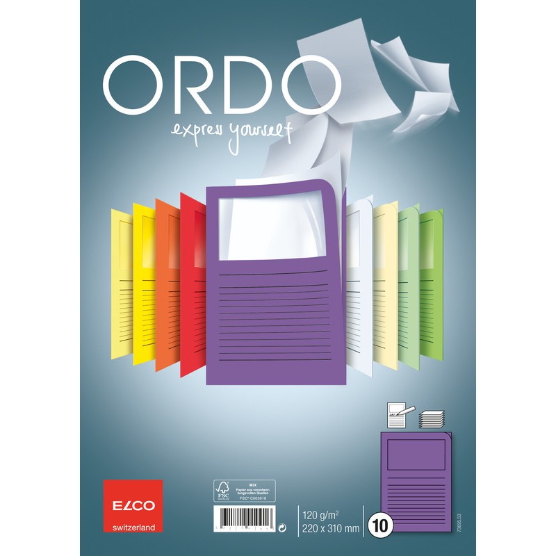 ELCO Sichthüllen Ordo classico aus Papier, 120 g/m2, Mappengrösse 220 x 310 mm, Sichtfenster Format 180 x 100 mm, für Format A4. Nachhaltigkeit eco:plus: recyclingfähig, recycelter Bestandteil. Zertifikat: FSC. mit Beschriftungsvordruck Cello-Zip zu 10 Stück.