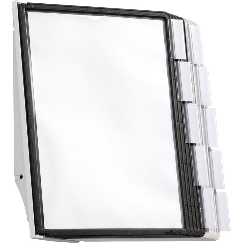 DURABLE Sichttafelsystem Sherpa® Wall 10 Wandelement aus glasfaserverstärktem PA, kann problemlos an Wänden oder Lochwänden montiert werden, mit Zapfenmechanik für einfaches Herausnehmen und Einfügen der Sichttafeln, erweiterbar. Set zu Wandelement, 10 reflexionsarme Sichttafeln für Format A4, farbig sortiert, 10 Reiter 58 mm mit blanko Einsteckschildern und Befestigungsmaterial, scannertauglich. Garantie: 5 Jahre.