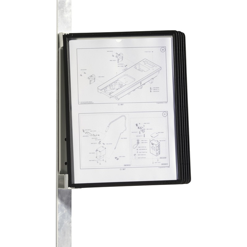 DURABLE Sichttafelsystem Vario® Magnet Wall 5 Wandelement aus Metall mit magnetischer Rückseite, kann schnell und einfach an metallischen Oberflächen wie Regalen oder Maschinen befestigt werden, mit Zapfenmechanik für einfaches Herausnehmen und Einfügen der Sichttafeln. Set zu Wandelement, 5 reflexionsarme, scannertaugliche Sichttafeln für Format A4 schwarz und 5 Reiter 58 mm mit blanko Einsteckschildern. Garantie: 5 Jahre.